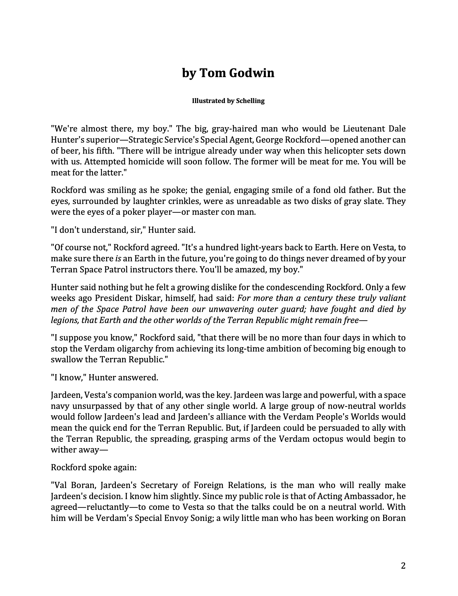 On Vesta, Lieutenant Dale Hunter is assigned to assist the enigmatic and beer-loving George Rockford, a Strategic Service agent with a cryptic plan to counteract the Verdam empire's expansion and secure an alliance with Jardeen, a pivotal neutral world. Rockford strategically uses Hunter to provoke Val Boran, a Jardeen diplomat, into realising his enduring love for Princess Lyla, a Vestan royal trapped by a proxy marriage to the odious and manipulative Lord Narf. Narf, conspiring with Verdam envoy Sonig, attempts to smear Hunter and Lyla using staged photographs and later hires assassins to kill Hunter, Lyla, and Boran. Rockford, however, orchestrates a rescue by the Royal Guard, leading to Narf and Sonig’s downfall. Narf is exiled to his estate with no female company, while Sonig faces likely execution upon his return to Verdam for his failures. Lyla marries Boran, uniting Jardeen and securing Vesta's allegiance to the Terran Republic. Despite his heroism, Hunter is left heartbroken, recognising that Lyla was never his to love, while Rockford reveals the success of his unconventional and devious strategy, proving that subtlety and cunning can triumph over brute force.